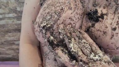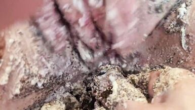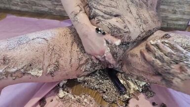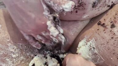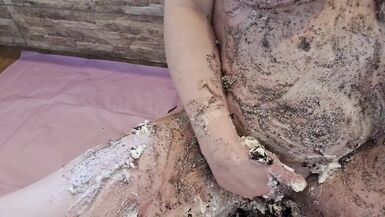. Some messy fun with cake, loved the feeling of that cold cream being rubbed all over my body, while I masturbate and get a messy dildo shoved in my pussy. Also had finger being shoved up my arse!