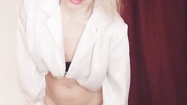 HORNY THE TEACHER FUCKS HERSELF WITH A PINK DILDO WHILE STANDING AND CUMS