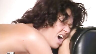 . Mature hairy pussy woman in heels gets banging and facial ending on the couch.
