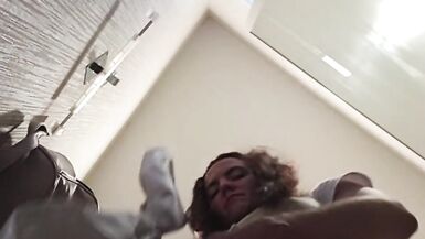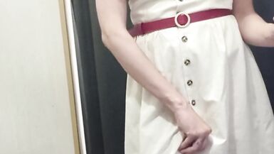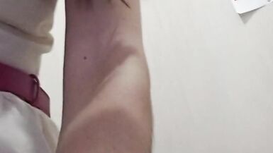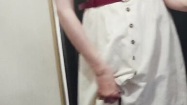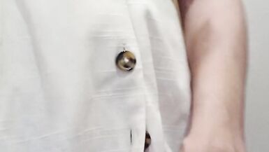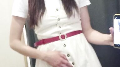 . Outdoors and without panties. Sexy slim milf is trying off jeans in the fitting room in department store. Pussy hairs are coming out of wide. Huge hairy pussy and big arse closeup.