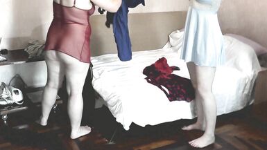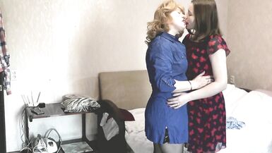 . Adult sexy blonde woman and beautiful sweet cute brunette girl in bedroom on bed in morning getting dressed kissing leaving for university and work. Lesbians. Two girls. Two women. Natural tits. Big natural tits. Ass. Beautiful ass. Legs. Stockings. Striptease. Erotic lingerie. Exhibitionism. Doggy style.